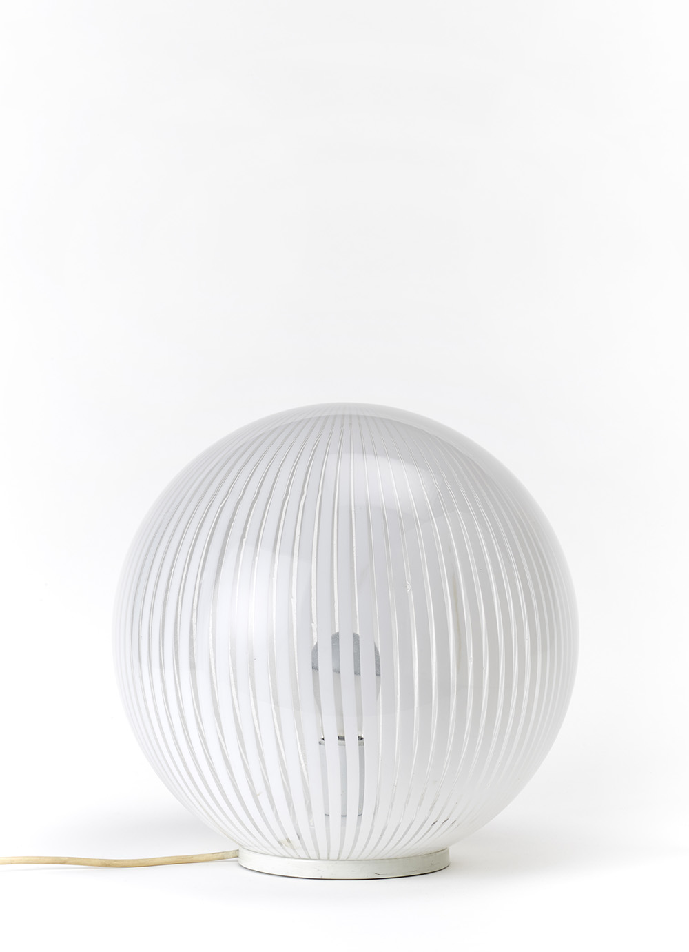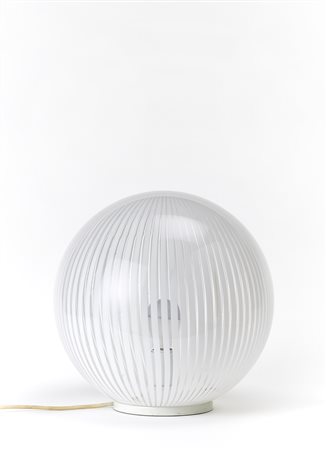 Lampada da tavolo della serie "Tessuti". Venini, Murano, 1982. Vetro soffiato a canne lattimo e cristallo. Base in alluminio laccato bianco. (d cm 40) (lievi difetti e mancanze)