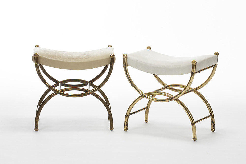 Pair of benches with tubular brass structure and seats covered in white fake leather. Italy, 1960s. (48x48x33 cm.) (slight defects and minor losses)
