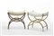 Coppia di panchette con struttura in tubolare di ottone e sedute rivestite in...