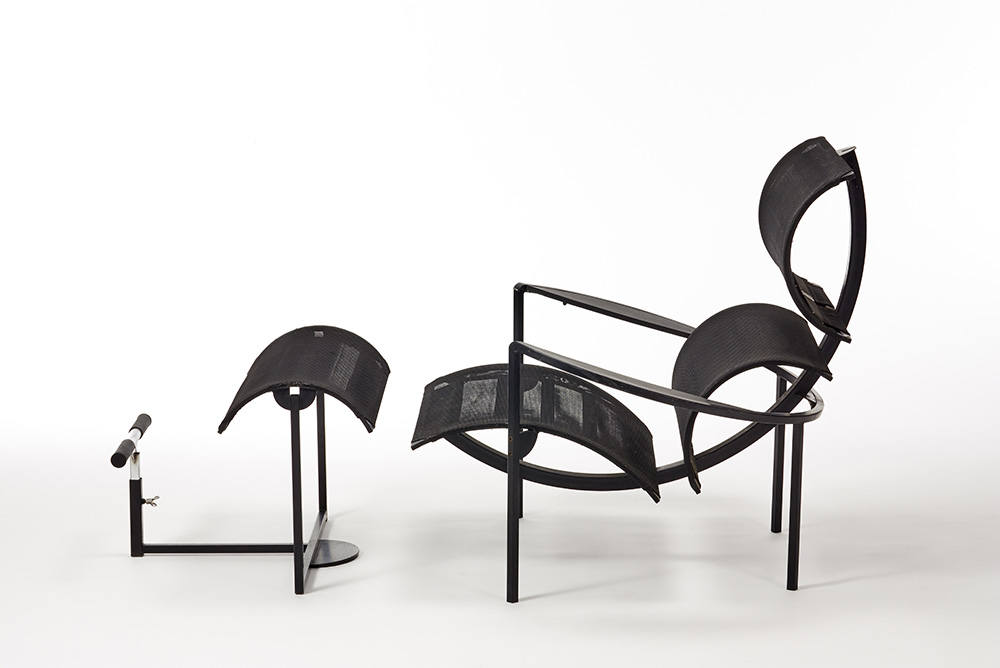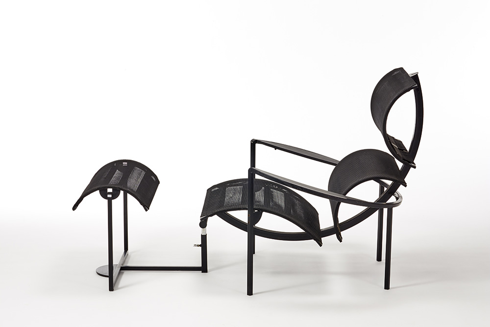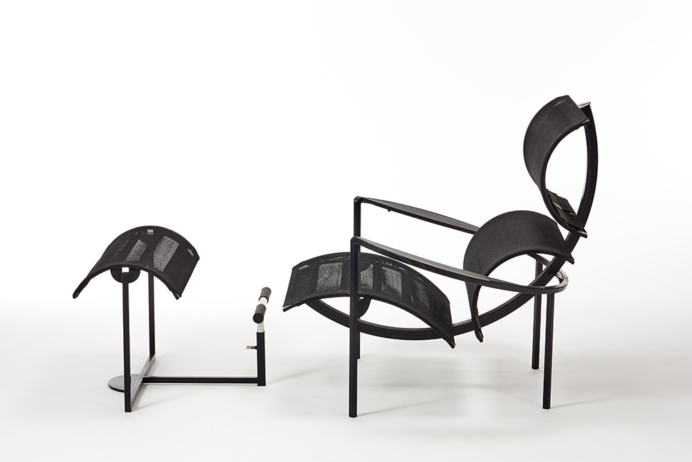 Poltona modello "Signorina Chan". Produzione Alias, Italia, 1986. Struttura in metallo verniciato nero e rete in poliestere. (poltrona: cm 89x89x95; pouf: cm 60x45x56) (lievi difetti)