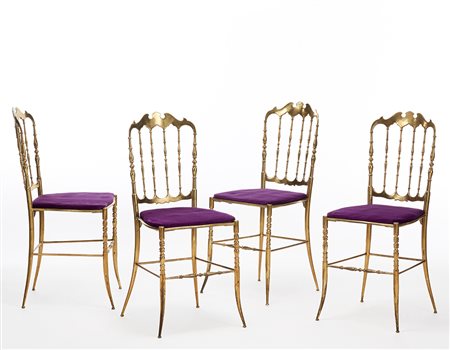 Lotto di quattro chiavarine in bronzo dorato con seduta rivestita in velluto sintetico ametista. Italia, anni '50. (cm 41x91x48,5) (lievi difetti e restauri)