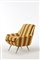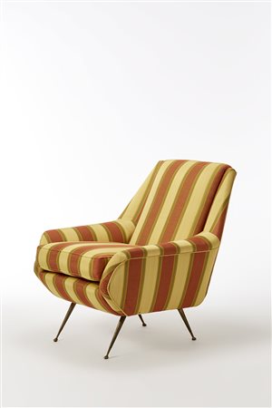 Poltrona imbottita con rivestimento in tessuto a righe gialle, verdi e rosso/arancio con gambe in ottone. Italia, anni '50. (cm 88x90x90) (lievi difetti)