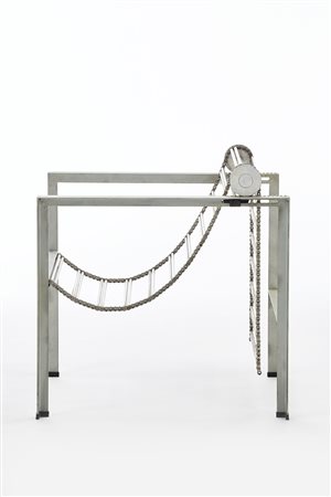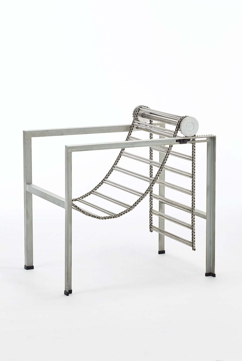 Poltroncina modello "Barba d'Argento". Italia, 1986. Seduta con struttura in metallo che permette per scorrimento, il progressivo allungamento e la regolarizzazione in altezza della seduta-schienale. (cm 51x72x71) (lievi difetti)
