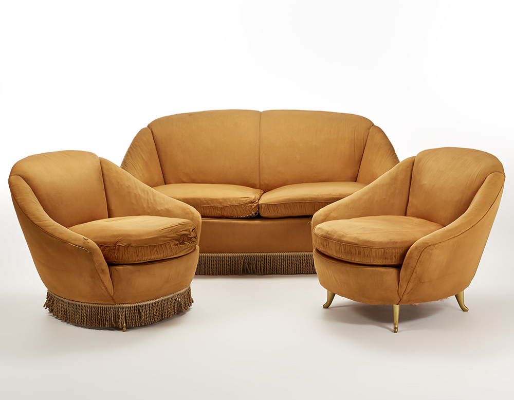 Living room composed of a sofa and two upholstered armchairs with yellow silk covering and legs in cast brass-plated aluminum. Ponte San Pietro, Bergamo, 1950s. (sofa: 160x75x90 cm; armchairs: 90x75x90 cm) (defects)