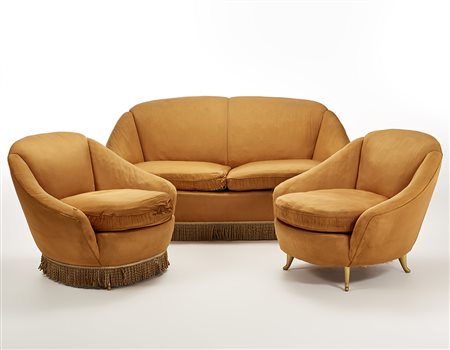 Salotto composto da un divano e due poltrone imbottiti con rivestimento in seta gialla e gambe in fusione di alluminio ottonato. Ponte San Pietro, Bergamo, anni '50. (divano: cm 160x75x90; poltrone: cm 90x75x90) (difetti)