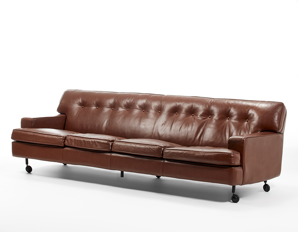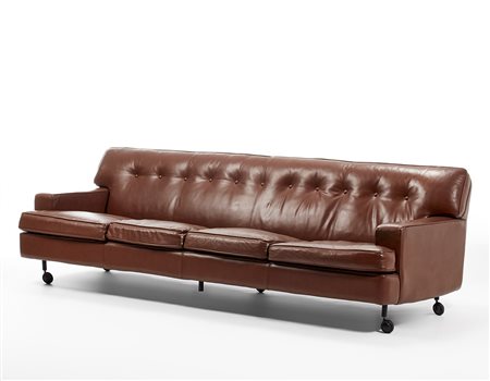 Divano a quattro posti modello "Square". Produzione Arflex, Milano, 1962. Rivestimento in pelle color testa di moro. Modello dotato di gambe su rotelle. (cm 254x77x83) (lievi difetti e piccole mancanze)