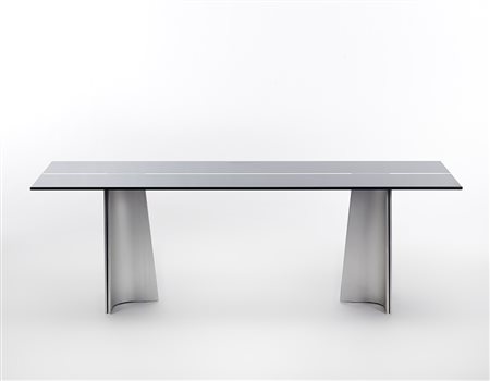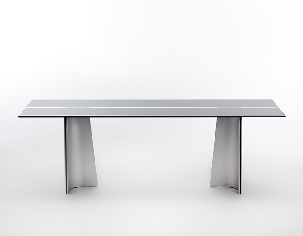 Tavolo modello "Ufo". Produzione Arrmet, 1972. Gambe a sezione cruciforme in metallo scatolato in lastra di alluminio anodizzato, piano in cristallo molato verniciato nero sulla superficie inferiore. (cm 220x70x79,5) (lievi difetti)