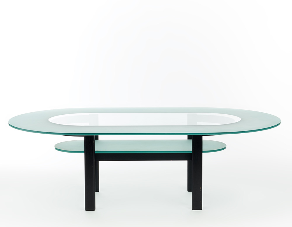 Grande tavolo da riunione modello "Shadow". Produzione ICF, Italia, 1983. Piano ovale in vetro sabbiato e lucido, struttura in legno e acciaio verniciati nero. (cm 240x74x140) (lievi difetti)
