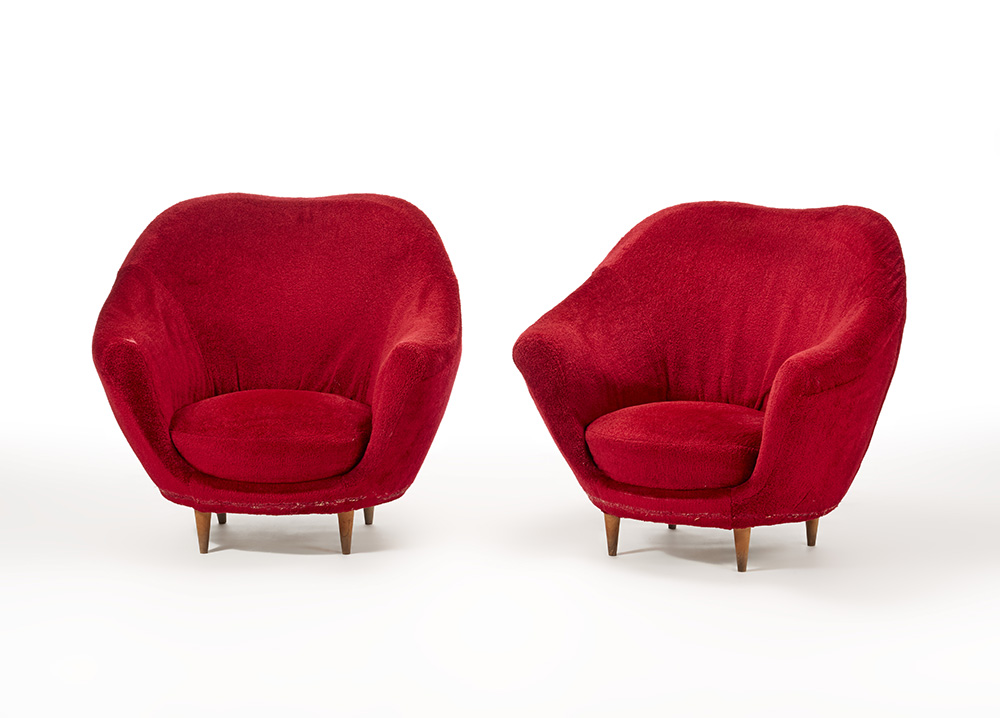 Pair of armchairs covered in red boucle. Italy, 20th century. (88x82.5x80 cm.) (defects, restorations and remakes)