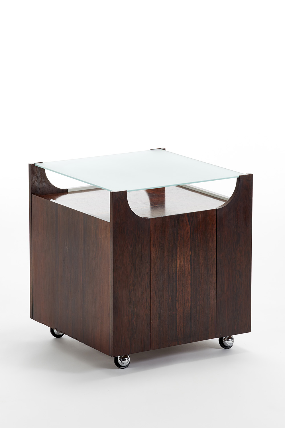 Bottle trolley. Produced by Stildomus, 1962. Structure in Indian solid and veneered rosewood, metal and acidato glass top on one side. Bearing manufacturer adhesive inside. (50x56x50 cm.) (slight defects and small restorations)
