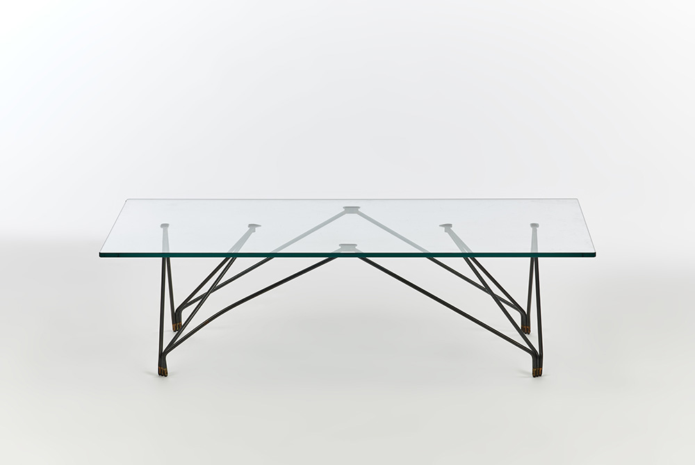Tavolino da salotto con piano rettangolare in cristallo molato e struttura in tondino d'acciaio brunito, terminali in ottone tornito. Italia, anni '60/'70. (cm 119,5x33x65) (lievi difetti)
