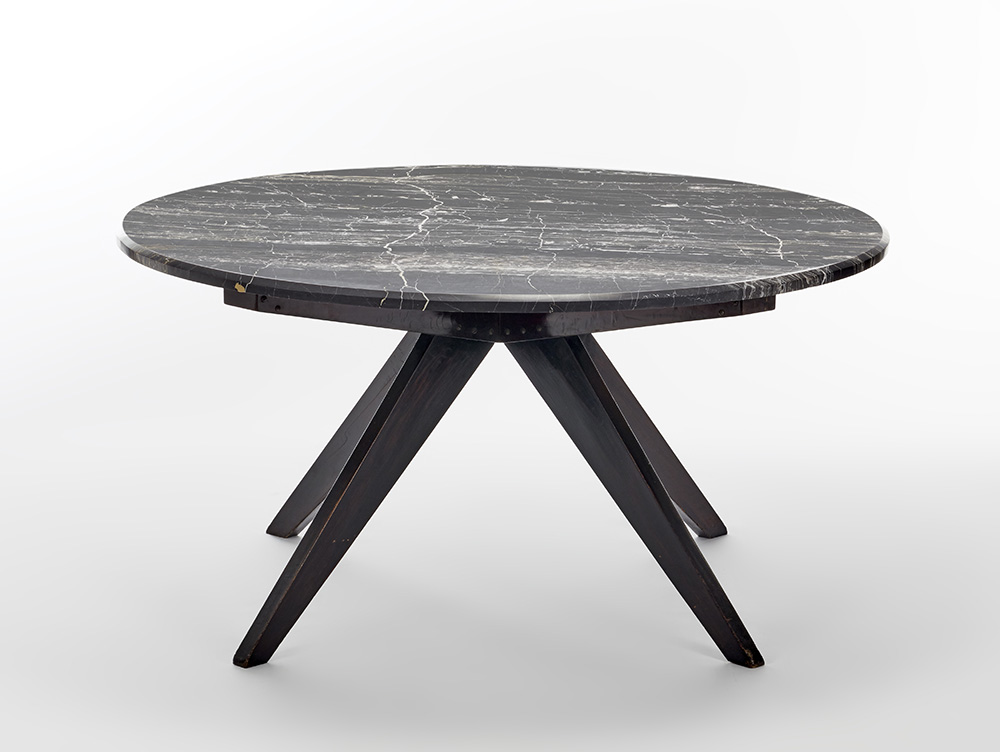 Tavolo circolare con piano in marmo nero venato, struttura a quattro gambe e...