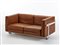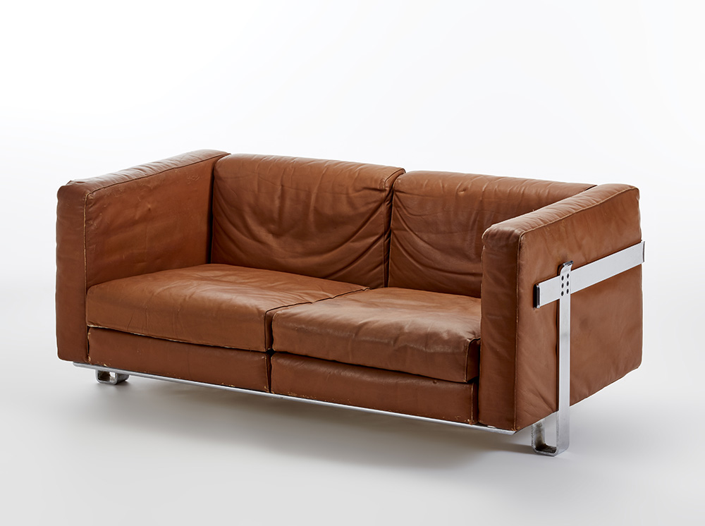 Divano a due posti modello "P11 Fasce cromate". Produzione Azucena, Milano, 1963. Struttura in acciaio cromato e rivestimento in cuoio color terra di siena. (cm 151x64x75) (lievi difetti)