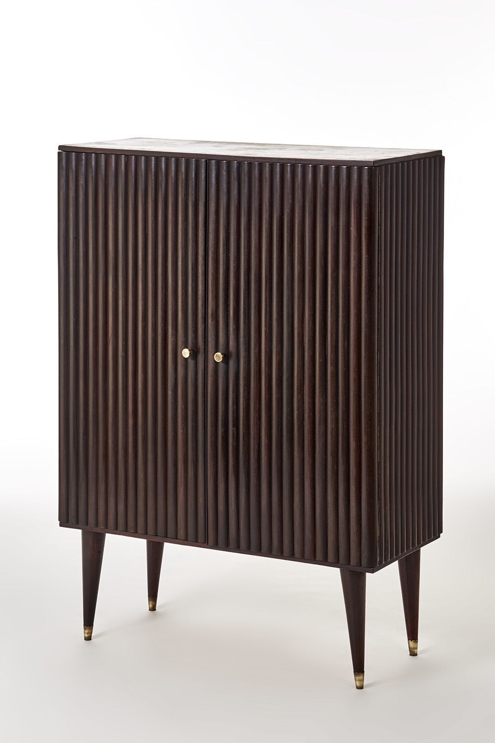 Furniture bar unit in solid and veneered mahogany wood with ribbed front and sides.Truncated cone legs and brass tips. Illuminable interior covered with mirror tiles. Italy, 1950s. (91.5x129.5x40 cm.) (slight defects)