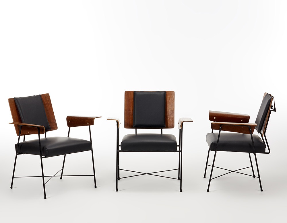 Lotto di tre poltroncine in tondino di metallo verniciato nero, compensato curvato e rivestimento in similpelle nera. Italia, anni '60. (cm 70,5x76,5x55) (lievi difetti e piccoli restauri)
