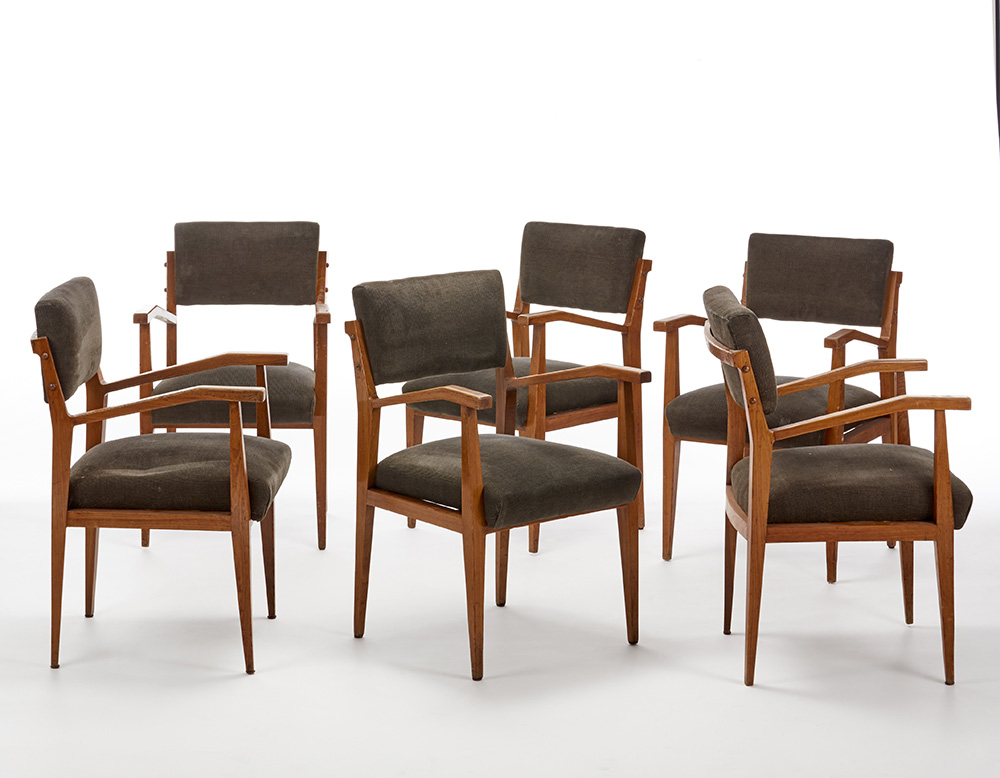 Lotto di sei poltroncine. Bergamo, anni '50. Struttura in legno di rovere massello e seduta e schienale imbottiti e rivestiti in tessuto grigio-verde. Recanti marchio del produttore. (cm 53x84x58) (lievi difetti, piccoli restauri e mancanze)