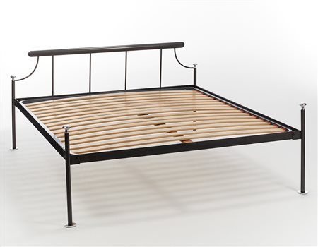 Letto matrimoniale modello "L5 Panchina ". Produzione Azucena, Milano, anni '70. Metallo laccato grigio e ottone cromato. (cm 205x90x180) (lievi difetti e piccole mancanze)