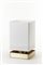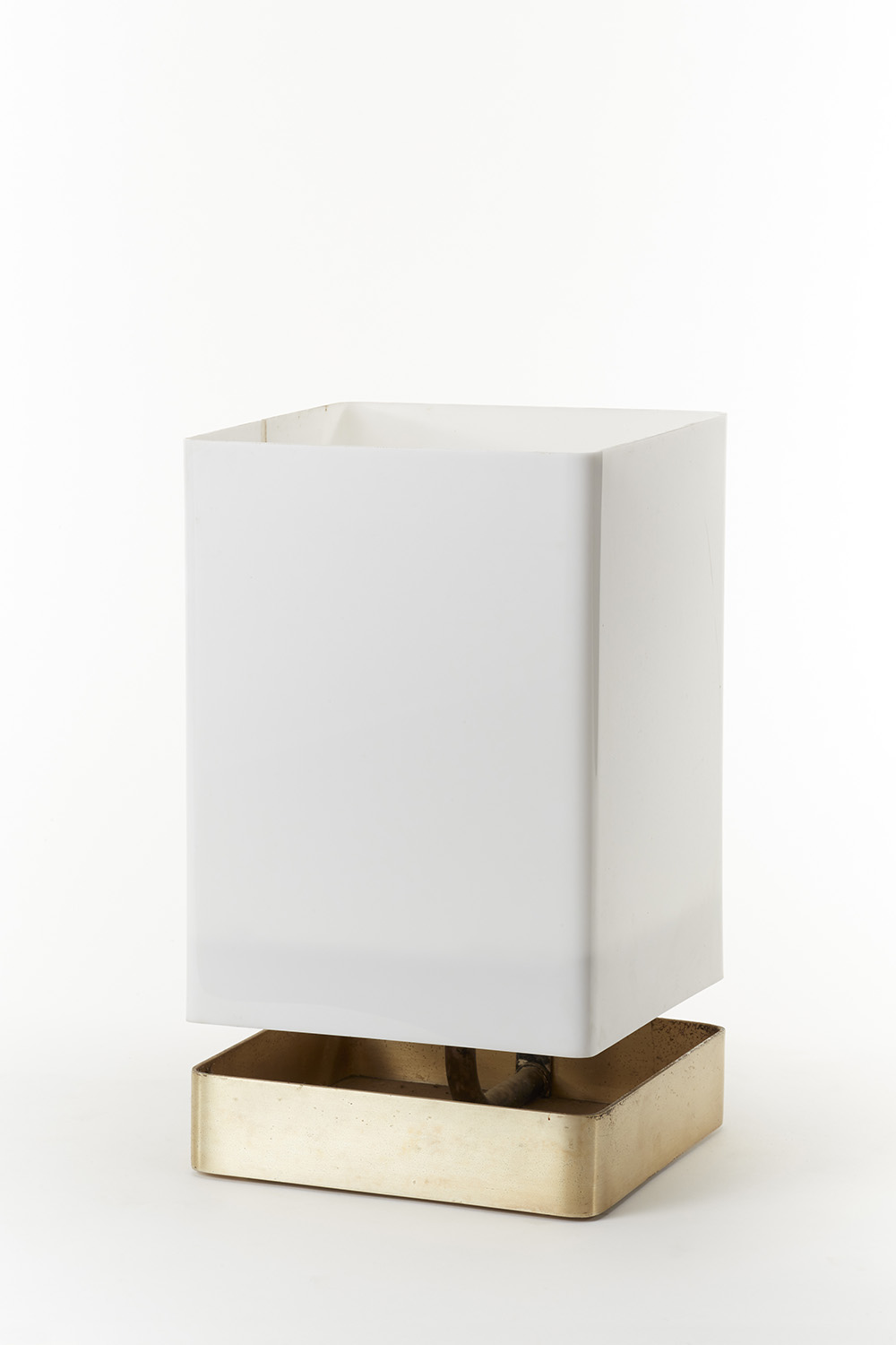 Table lamp with parallelepiped diffuser in opaline plexiglass. Base in folded metal sheet, hand-brushed, gilded. Bregnano, 1975. Experimental model produced by the author in a limited edition. (22.5x38x22.5 cm.) (slight defects)