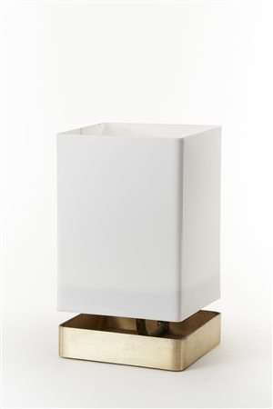 Lampada da tavolo con diffusore parallelepipedo in plexiglass opalino. Base in lamina di metallo piegata, spazzolata a mano, dorata. Bregnano, 1975. Modello sperimentale prodotto dall'autore in serie limitata. Firma "SABATTINI" incussa alla base. (cm 22,5x38x22,5) (lievi difetti)