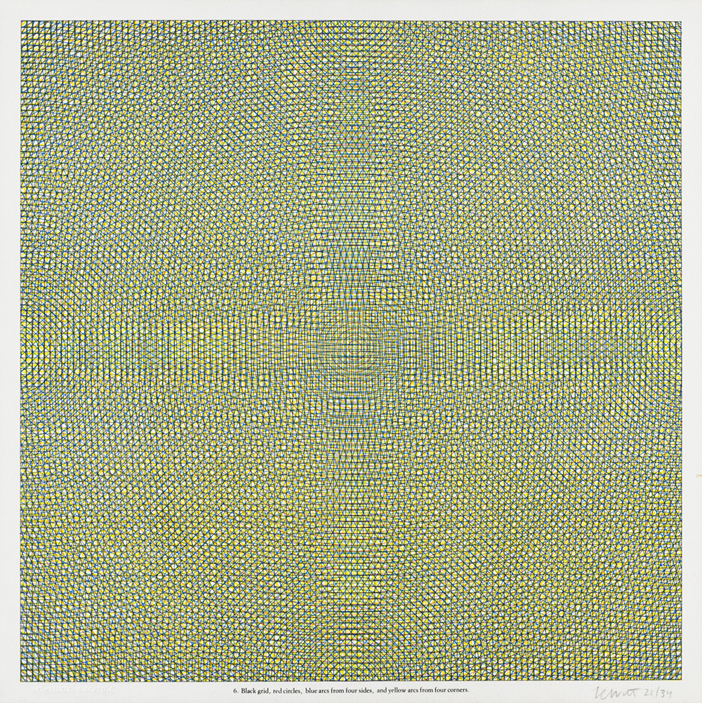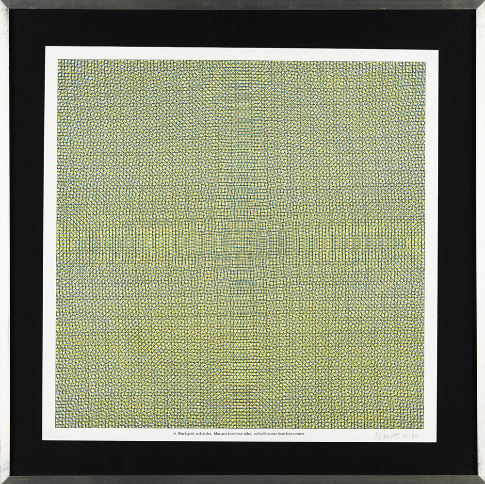 Sol Lewitt 1928 - 2007 Black grid, red circles, blue arcs from four sides, and yellow arcs from four corners - 1972 tecnica Multiplo, serigrafia su carta Dimensioni cm. 38 x 38 Firma Firmato in basso a destra Note Edizione Artestudio, Macerata Timbro a secco Artestudio Macerata in basso a sinistra Opera n. 21/34 Provenienza Collezione Privata