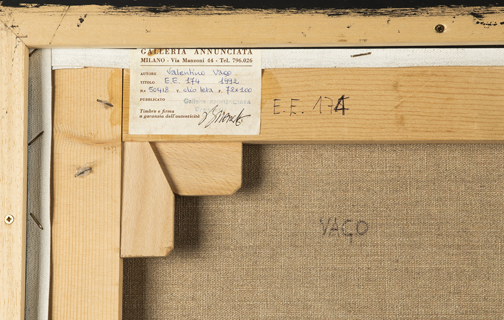 Valentino Vago 1931 - 2018 E.E. 174 - 1992 tecnica Olio su tela Dimensioni cm. 75 x 100 Firma Firmato sul retro Note Etichetta e timbro Galleria Annunciata, Milano sul retro Provenienza Collezione Sergio Grossetti, Annunciata Milano Collezione Privata Pubblicazioni “Valentino Vago - Catalogo ragionato delle opere - Volume terzo 1978 - 2010”, a cura di Ornella Mignone, Skira Editore, 2012, p. 837 tav. 1992/74 “Valentino Vago”, catalogo mostra Galleria Annunciata, Milano, (11 marzo - 30 aprile 1993), p. 27 “Vago”, catalogo mostra Galleria d’Adda, Capriate San Gervasio (8 - 30 maggio 1993), p. 27 Esposizioni “Vago”, Improvvisazione Prima Galleria d’Arte, Trento, 20 ottobre - 22 novembre 1993 “Omaggio a Valentino Vago. Opere dal 1969 al 1973”, Galleria Annunciata, Milano, 4 marzo - 25 maggio 2009