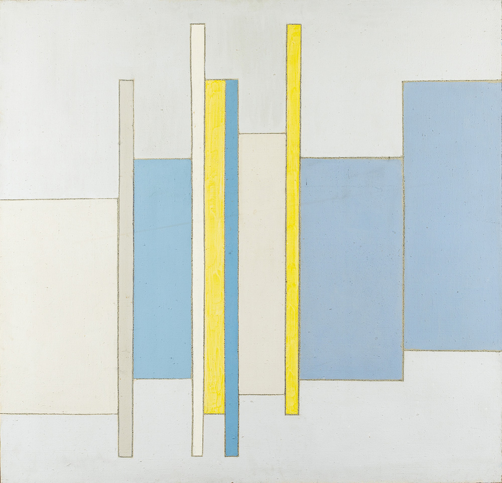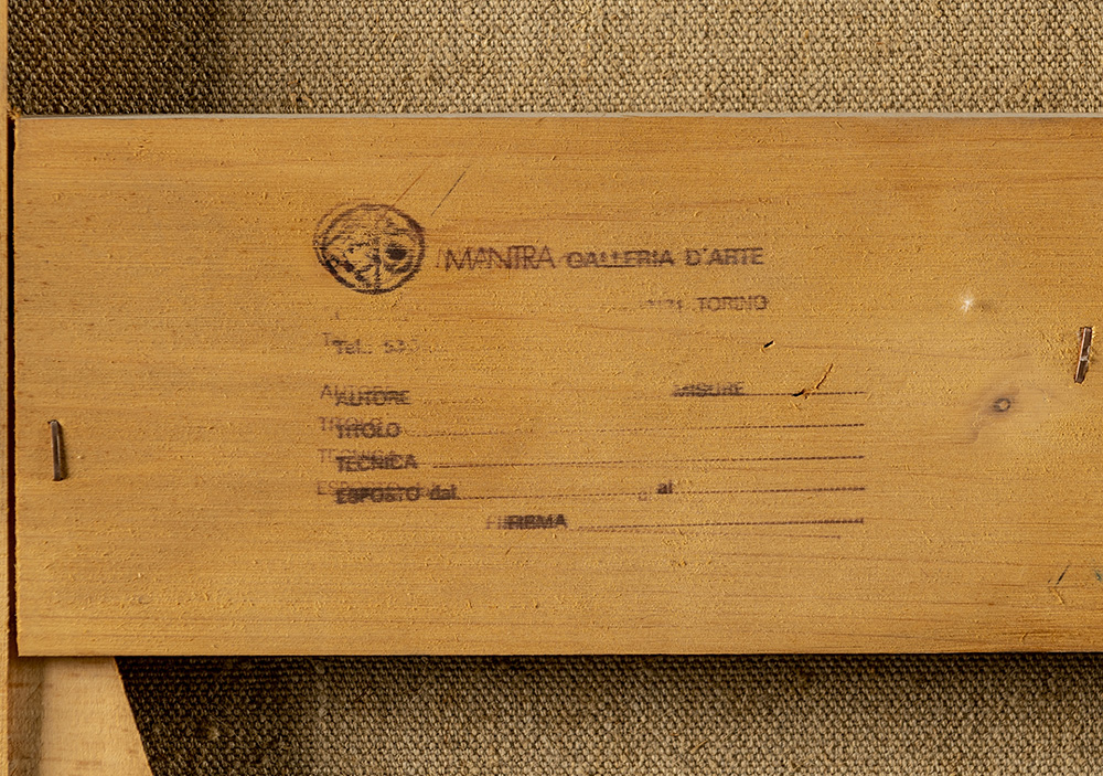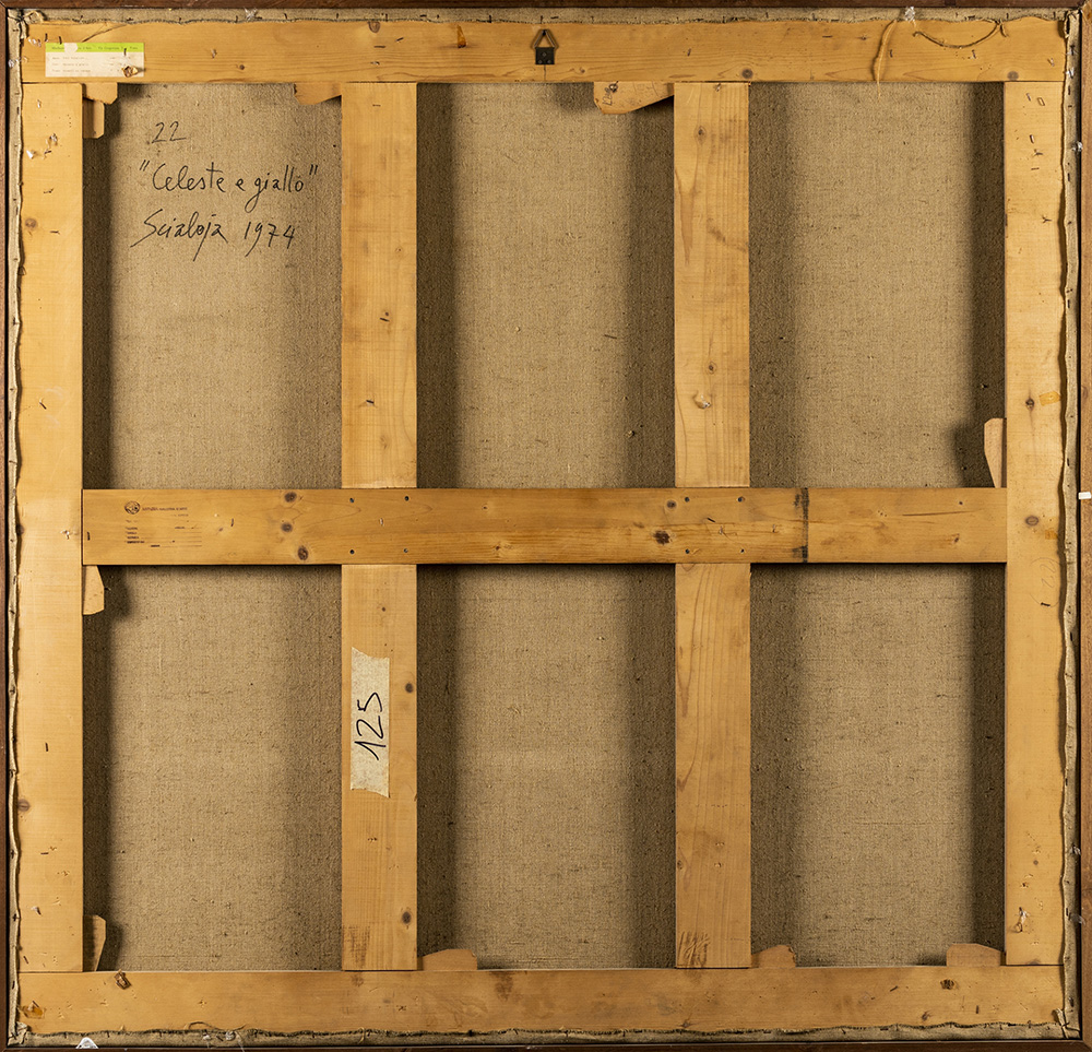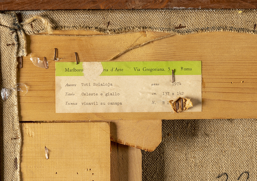 Toti Scialoja 1914 - 1998 Celeste e giallo - 1974 tecnica Vinavil su canapa (tela) Dimensioni cm. 137 x 142 Firma Firmato e datato sul retro Note Timbro Mantra Galleria d’Arte, Torino sul retro Etichetta Marlborough Galleria d’Arte, Roma sul retro Provenienza Collezione Carla Panicali di Montalto, Galleria Marlborough, Roma Collezione Privata