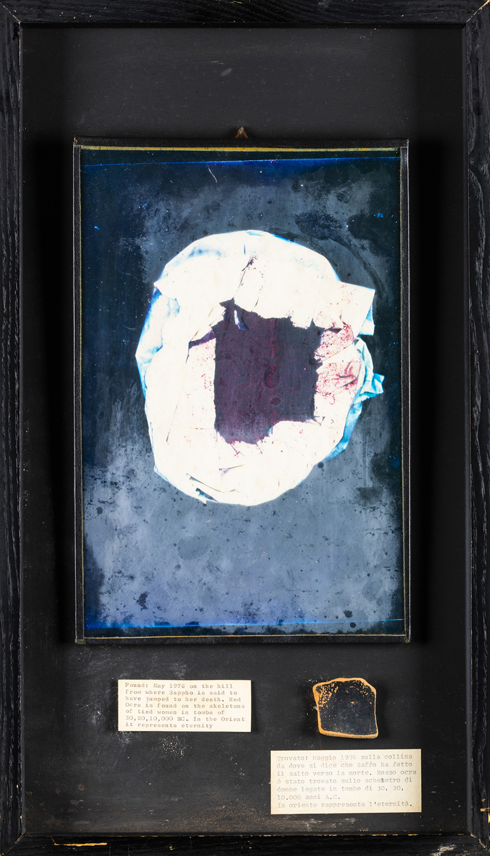 Stephanie Oursler 1938 Senza titolo tecnica Assemblaggio, tecnica mista su carta, carta stampata, pietra in box di legno Dimensioni cm. 56 x 32,5 Provenienza Collezione Privata