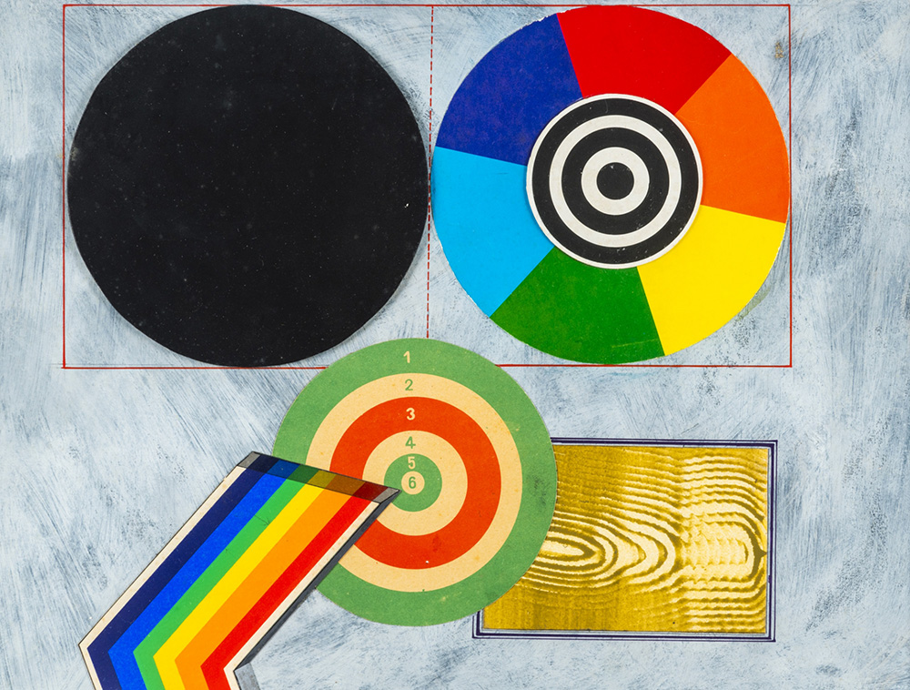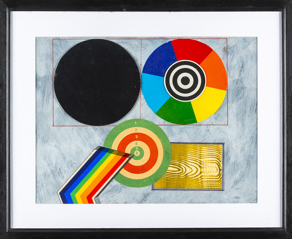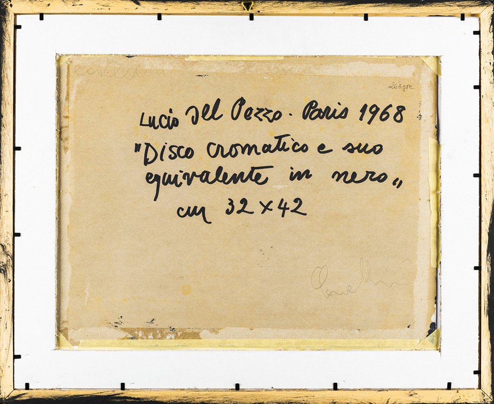 Lucio Del Pezzo 1933 Disco cromatico e suo equivalente in nero - 1968 tecnica Tecnica mista e collage su cartoncino Dimensioni cm. 31 x 41 Firma Firmato e datato sul retro Documenti Certificato di Garanzia e Provenienza ArteTivù, Venezia Provenienza Collezione Privata