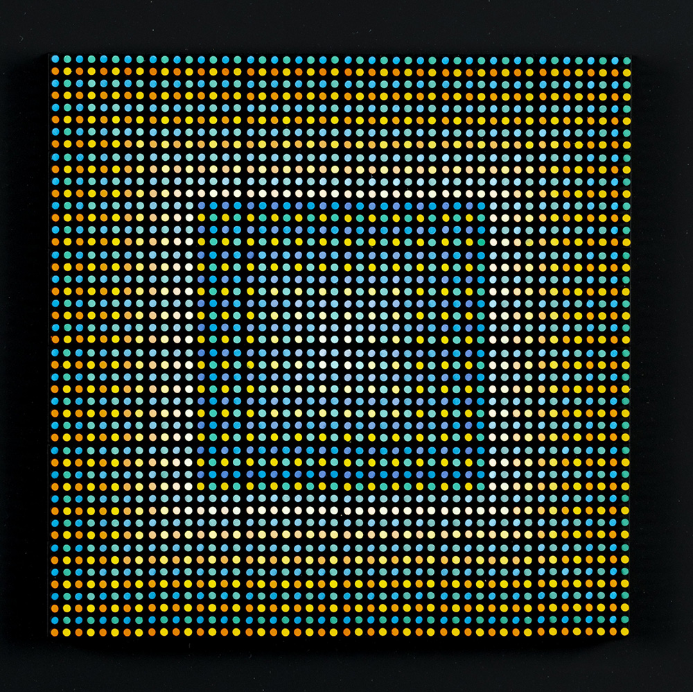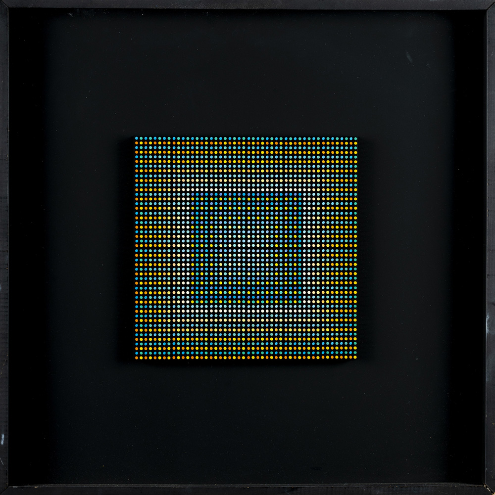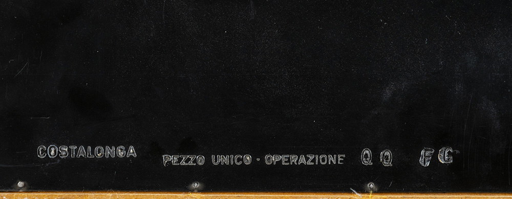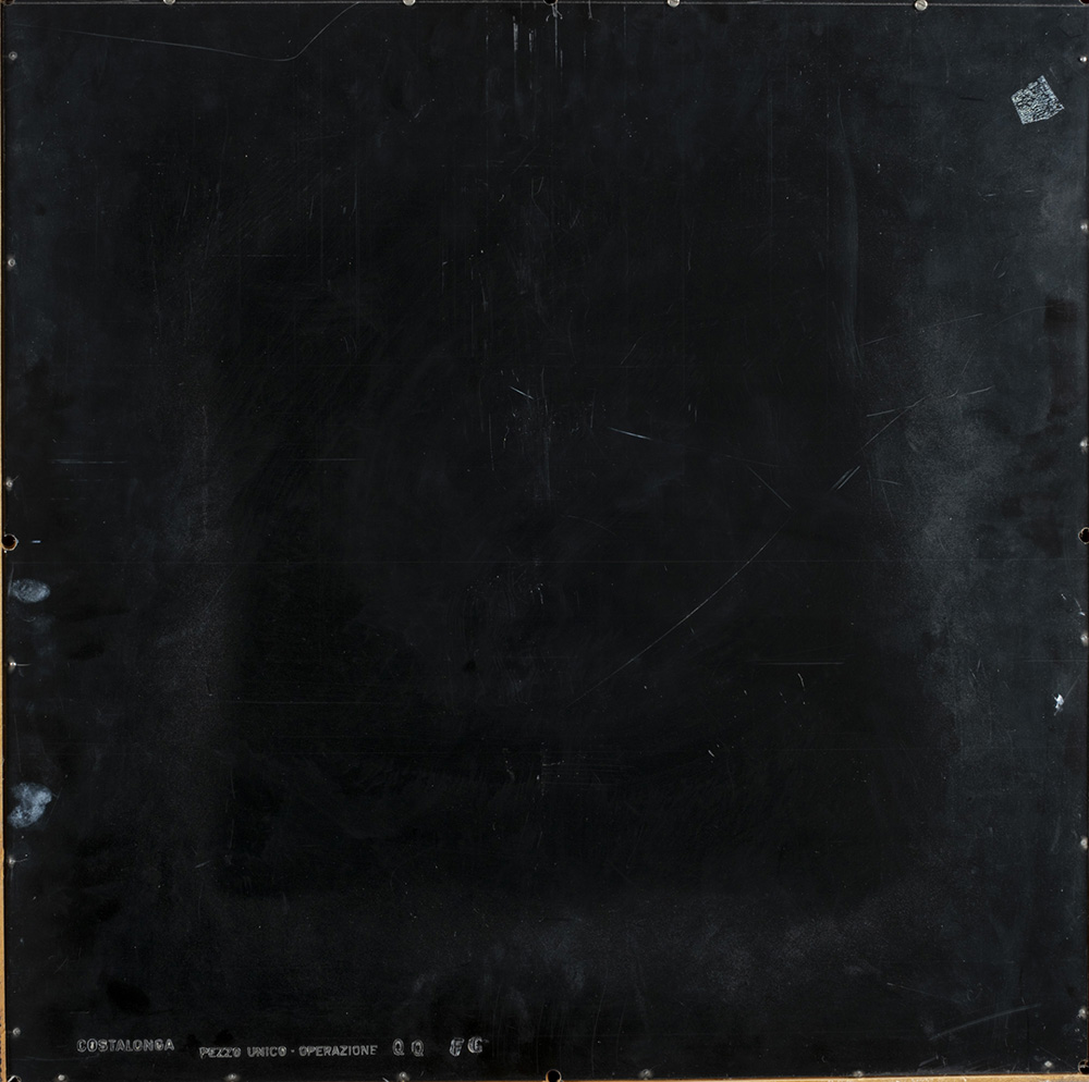 Franco Costalonga 1933 Operazione QQ FG tecnica Cilindretti dipinti su tavola Dimensioni cm. 52,5 x 52,5 (interno cm. 23,5 x 23,5) Note Timbro a secco dell’artista sul retro Opera unica Provenienza Collezione Privata