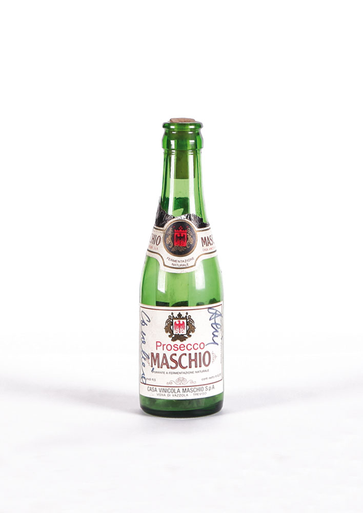 ALIK CAVALIERE Roma 1926 - Milano 05/05/1998 Messaggio in bottiglia carta e metallo entro bottiglia in vetro altezza cm. 19, firma sull'etichetta, attestato di autenticità e provenienza della Società Di Mano in Mano (MI) allegata.