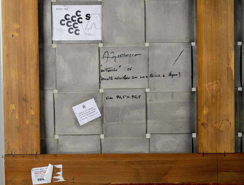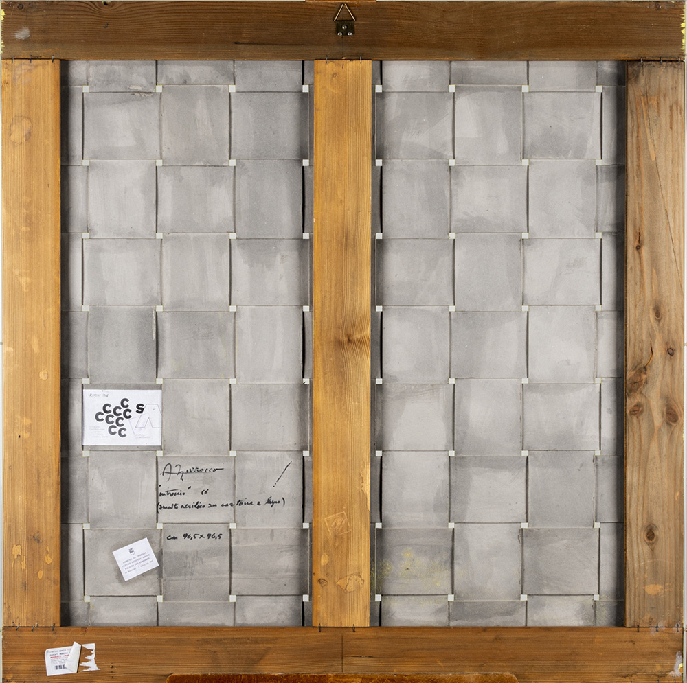 Armando Marrocco 1939 Intreccio - 1966 tecnica Smalto acrilico su cartone intrecciato applicato su telaio Dimensioni cm. 96,5 x 96,5 Firma Firmato e datato sul retro Documenti Autentica dell'artista su fotografia Note Etichetta Comune di Ferrara, sul retro Etichetta 17. Convegno internazionale artisti, critici, studiosi dell’arte, sul retro Timbro Visualità, Milano sul retro Provenienza Collezione Privata Esposizioni “17. Convegno internazionale artisti, critici, studiosi d’arte: Strutture ambientali”, Rimini, 1968 Centro Attività visive, Palazzo dei Diamanti, Ferrara, 15 maggio - 5 giugno 1977