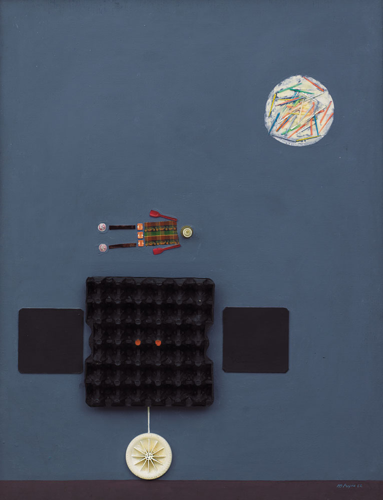 MARIO PERSICO Napoli 1930 Carro funebre per un ipocondriaco, 1962 olio e applicazioni su tela cm. 116x89, firma e anno in basso a destra, titolo, firma e anno al retro sul telaio.