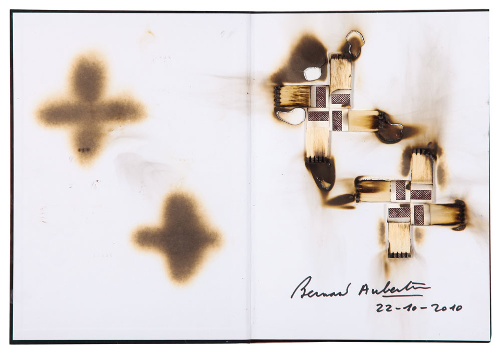 BERNARD AUBERTIN Fontenay aux Roses 1934 Dessin de feu, 2010 applicazioni di fiammiferi e combustioni su libro "Bernard Aubertin, il fuoco e il rosso", edizioni Galleria Rosenberg cm. 30,5x45, firma in basso a destra, dichiarazione d'autenticità dell'artista su foto, entro teca in plexiglass.