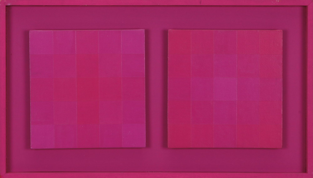 JORRIT TORNQUIST Graz 1938 Opus 426 (dittico) acrilico su 2 carte applicate su tavola cm. 20x20 cadauna, riportate su faesite cm. 30x55, opera non firmata, etichette dell'Archivio Tornquist n° 1971/0037 (A+B) al retro, dichiarazione d'autenticità dell'artista e timbro dello Studio d'Arte G.R. (Sacile-PN) su stampa fotografica.