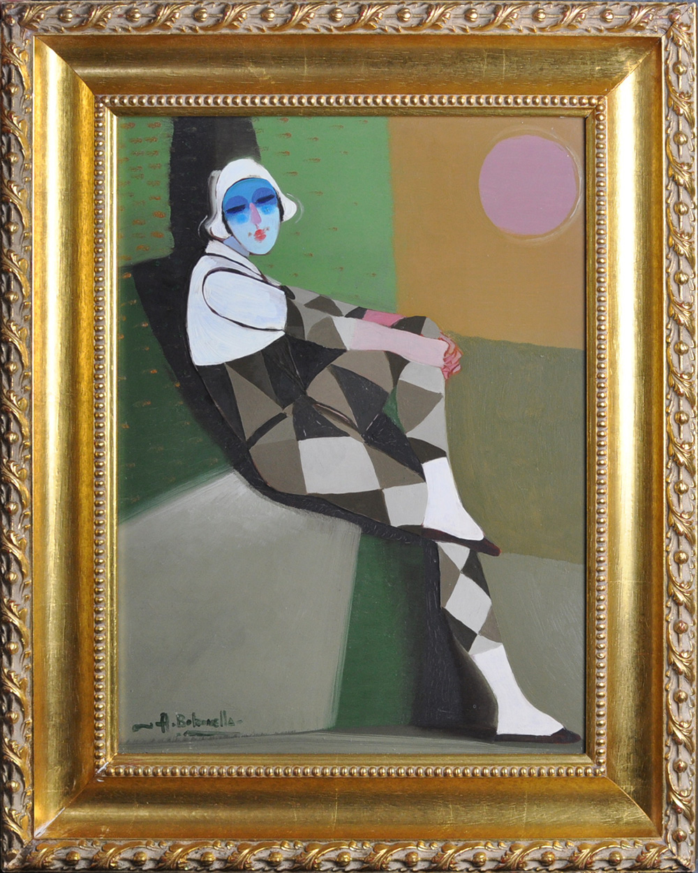 ALBERTO BOLZANELLA Arlecchino Tecnica mista su masonite Anni 80 Dim. 50x40 Firmato in basso a sx
