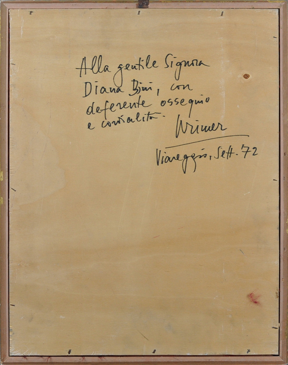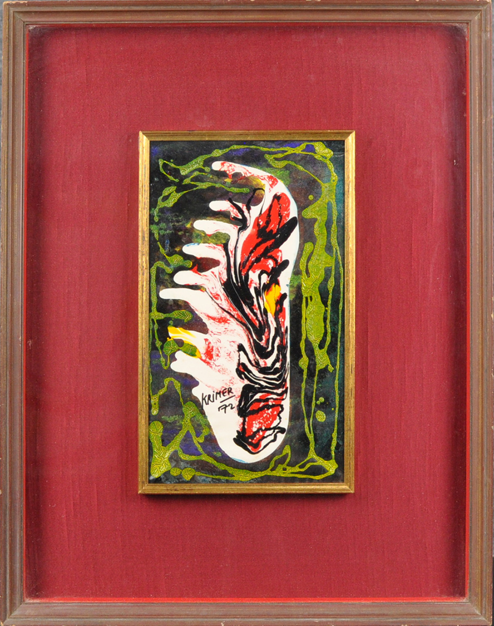 KRIMER Fantasia colorata Tecnica mista Anno 1972 Dim. 27x16 Al verso dedica ad personam Datato e firmato in basso al centro