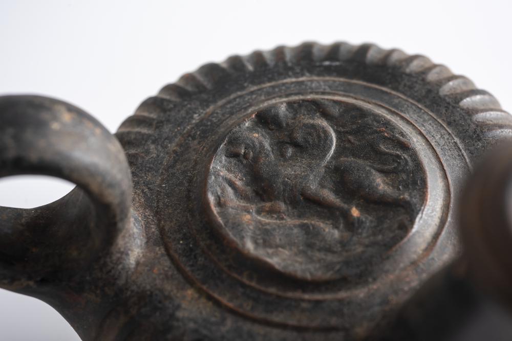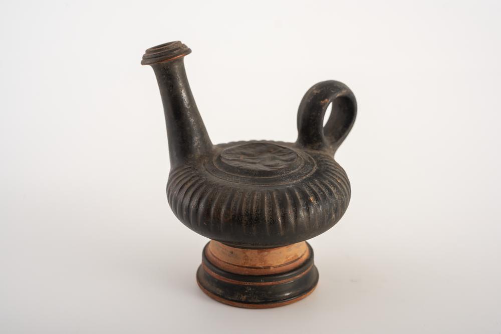 GUTTUS A VERNICE NERA DATAZIONE: IV-III sec. a. C. MATERIA E TECNICA: argilla figulina rosata, vernice bruna opaca, decorazione ad impressione, modellato a tornio veloce e a stampo Guttus con alto piede cilindrico sagomato, serbatoio globulare schiacciato decorato da sottili striature verticali, alto bocchello lievemente obliquo con orlo estroflesso scanalato, ansa ad anello verticale, sul serbatoio medaglione a rilievo con scena di combattimento fra un grifone alato incedente a destra ed un altro animale PRODUZIONE: ceramica etrusca a vernice nera STATO DI CONSERVAZIONE: integro PROVENIENZA: Casa d’aste Hirsch, Monaco, 2008 DIMENSIONI: alt. cm 13; diam. cm 10 Il lotto, in base alla legge italiana, non è esportabile / This lot, according to Italian law, can not be exported
