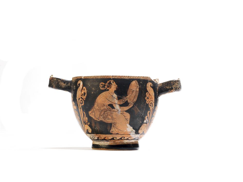 PISSIDE SKYPHOIDE SICELIOTA A FIGURE ROSSE DATAZIONE: IV sec. a.C. MATERIA E TECNICA: argilla figulina rosata; vernice nera lucente, eseguita a tornio veloce Vasca con labbro obliquo verso l’interno per l’alloggiamento del coperchio; vasca troncoconica a profilo convesso, piede ad echino modanato DECORAZIONE ACCESSORIA: vasca interamente verniciata in nero ad eccezione dell’interno delle anse, dell’attacco col piede e della parte inferiore del piede; sul bordo fascia risparmiata con decorazione a puntini, sotto le anse grande palmetta aperta fra volute e infiorescenze, alla base della scena figurata meandro ad onda DECORAZIONE: lato A: figura femminile seduta a sinistra sopra uno sgabello con i capelli raccolti in una crocchia sulla nuca e fermati da una tenia; la donna, a torso nudo, è in atto di suonare un cembalo ed indossa un mantello drappeggiato intorno alla vita e alle gambe, di fronte a lei un arbusto ed una situla; lato B: giovane donna gradiente a sinistra e retrospiciente, con le braccia sollevate ed una cista nella mano sinistra; la donna ha i cappelli raccolti in una crocchia ed indossa un chitone plissettato fermato in vita da una fascia le cui pieghe si aprono seguendo il movimento PRODUZIONE: Sicilia, Gruppo di Lentini STATO DI CONSERVAZIONE: ricomposta da frammenti con piccole integrazioni DIMENSIONI: alt. cm 11; diam. cm 13 CFR.: A. D.Trendall Red Figure Vases of South Italy and Sicily, London, 1989, p.235. Il lotto, in base alla legge italiana, non è esportabile / This lot, according to Italian law, can not be exported