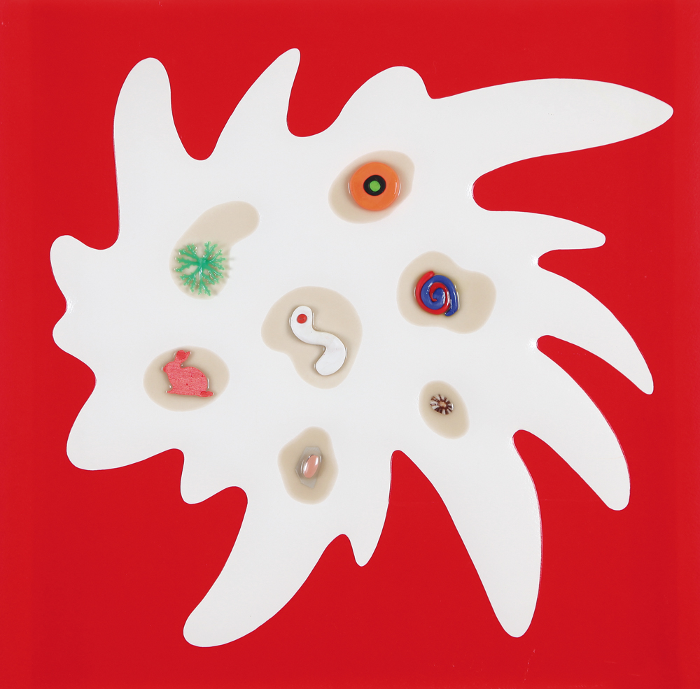 RENZO NUCARA Crema 1948 Bang 10-37, 2011 resine, oggetti, colore serigrafico, carta, legno su faesite cm. 50x50, firma, archivio dell'artista e descrizione dell'opera al retro, dichiarazione d'autenticità e archivio dell'artista su foto, entro teca in plexiglass.