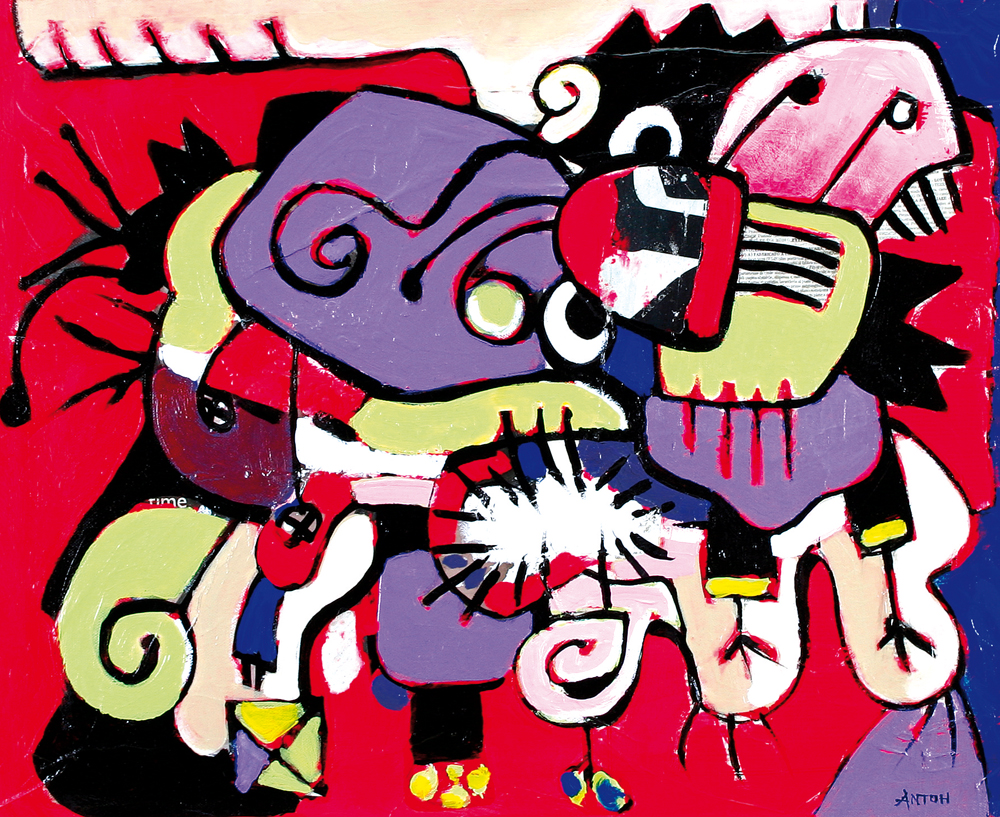 ANTOH Napoli 18/05/1960 Bioenergetics, 2012 olio e collage su tela cm. 50x60, firma in basso a destra, titolo, firma, anno e bozzetto per dipinto al retro, opera senza cornice.