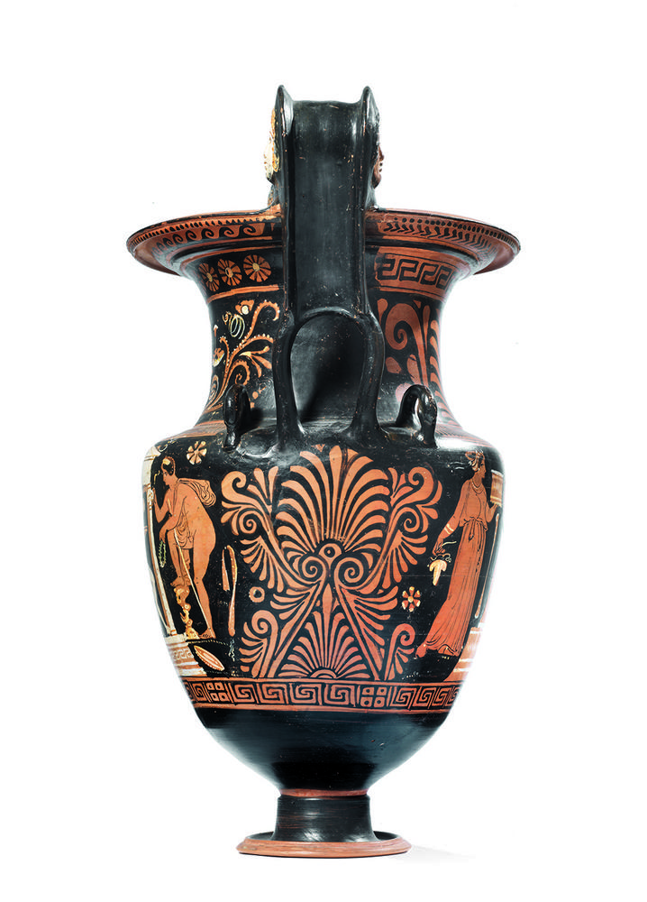 GRANDE CRATERE A VOLUTE APULO A FIGURE ROSSE DATAZIONE: metà IV sec. a. C. MATERIA E TECNICA: argilla figulina camoscio, vernice nera lucente, coloritura arancio, suddipinture in bianco e arancio, modellato a tornio veloce e a stampo Labbro a tesa, con labbro ripiegato e concavo, collo cilindrico a profilo concavo distinto dalla spalla appiattita, grande corpo ovoide, alte anse a volute con margini rilevati impostate su una staffa verticale; lungo la costa verticale dell’ansa, in corrispondenza delle volute, foro circolare sul lato interno; volute racchiudenti due teste di Gorgone suddipinte in bianco, piede campanulato e scanalato al taglio; ai lati delle anse teste di cigno erette col becco appoggiato sulla spalla del vaso. DECORAZIONE ACCESSORIA: interno della bocca verniciato, labbro risparmiato; sotto al labbro fila di puntini; sulla spalla falsa baccellatura, al di sotto delle scene figurate meandro sinistrorso interrotto da motivo a scacchiera; sotto alle anse grande palmetta doppia aperta a ventaglio fra girali e volute; ai lati delle anse teste di cigno in rilievo DECORAZIONE: lato A) sotto il labbro meandro ad onda destrorso, sul collo profilo femminile volto a sinistra con kekryphalos, stephane di perle, orecchini e collana che sorge da un fiore ed è circondato da grandi volute e infiorescenze; sul ventre naiskos in bianco con colonne ioniche sotto al quale si trova la figura del defunto, in nudità eroica, seduto a sinistra sul suo mantello, le gambe incrociate, in atto di appoggiarsi alla lancia e sostenere una phiale; alla sua sinistra una giovane donna riccamente abbigliata in atto di offrirgli un unguento contenuto nell’alabastron che sorregge nella mano sinistra mentre nella destra tiene un cembalo; dall’altro lato un giovane nudo volto verso il defunto col mantello drappeggiato sulla spalla e sul torace con strigile nella mano destra e corona nella sinistra; ai lati del podio due grandi patere; lato B) sotto al labbro motivo a chevron, sul collo meandro continuo destrorso e grande palmetta aperta a ventaglio fra volute; sul ventre stele funeraria su podio a cui è legata una tenia nera sormontata da un grande bacile; a sinistra giovane donna riccamente abbigliata con un grappolo d’uva nella mano destra ed un cista e una tenia nella sinistra; dall’altro lato un giovane nudo con mantello drappeggiato sul braccio sinistro che sorregge una phiale mentre nella destra tiene uno specchio e una tenia PRODUZIONE: ceramica apula a figure rosse, Gruppo di Copenhagen, Pittore di Copenhagen 4223 STATO DI CONSERVAZIONE: integralmente ricomposto da frammenti con alcuni restauri alla pittura DIMENSIONI: alt. cm 52, diam. bocca cm 18 PROVENIENZA: CS1Firenze CFR.: A.D. Trendall,The Red-figured Vases of South Italy and Sicily, Oxford 1978-1982, pp. 456, 462-3 Il lotto, in base alla legge italiana, non è esportabile / This lot, according to Italian law, can not be exported