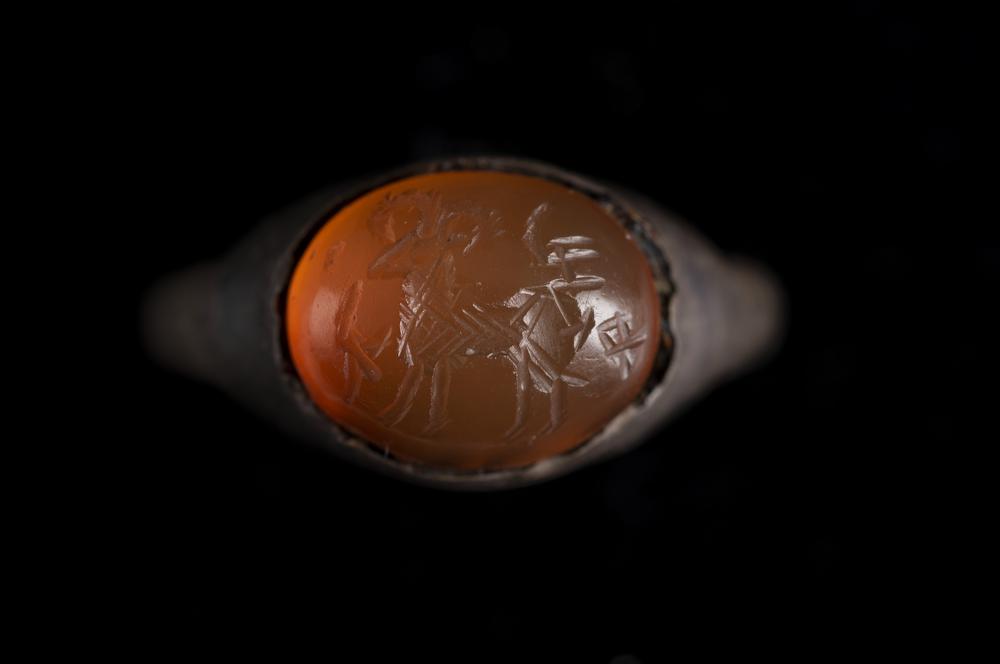 ANELLO IN ARGENTO DATAZIONE: I-II sec. d. C. MATERIA E TECNICA: argento fuso e cesellato, corniola incisa Anello in verga di argento a sezione cilindrica con castone ellittico in corniola decorato con un ariete gradiente a destra PRODUZIONE: cultura romana STATO DI CONSERVAZIONE: integro, ossidato DIMENSIONI: diam. cm 2 PROVENIENZA: Marino Taini, Arte Primitivo, New York 2006 Il lotto, in base alla legge italiana, non è esportabile / This lot, according to Italian law, can not be exported