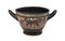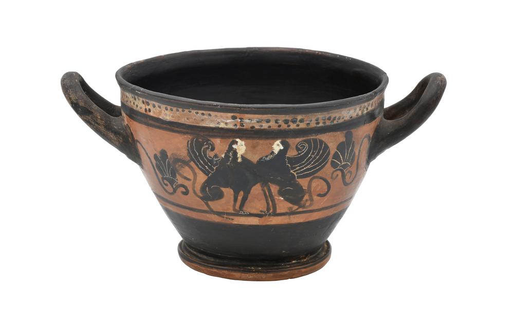 SKYPHOS ATTICO A FIGURE NERE DATAZIONE: inizi V sec. a.C. MATERIA E TECNICA: argilla figulina arancio, vernice nera, suddipinture in bianco, dettagli resi a graffito, modellato a tornio veloce Orlo arrotondato, labbro leggermente estroflesso, vasca troncoconica, piede troncoconico, anse a bastoncello impostate sulla massima espansione e ritorte verso l’alto DECORAZIONE ACCESSORIA: sono interamente verniciati la vasca, le anse e la parte inferiore del corpo, il bordo esterno del piede; sotto l’orlo doppia fila di puntini paralleli; ai lati delle anse palmette aperte a ventaglio e girali vegetali DECORAZIONE: fra le anse due sfingi alate, sedute sulle zampe posteriori in composizione araldica PRODUZIONE: ceramica attica a figure nere STATO DI CONSERVAZIONE: integralmente ricomposto da frammenti DIMENSIONI: alt. cm 10,5; diam. cm 14,5 PROVENIENZA: Casa d’aste Pandolfini Firenze Il lotto, in base alla legge italiana, non è esportabile / This lot, according to Italian law, can not be exported