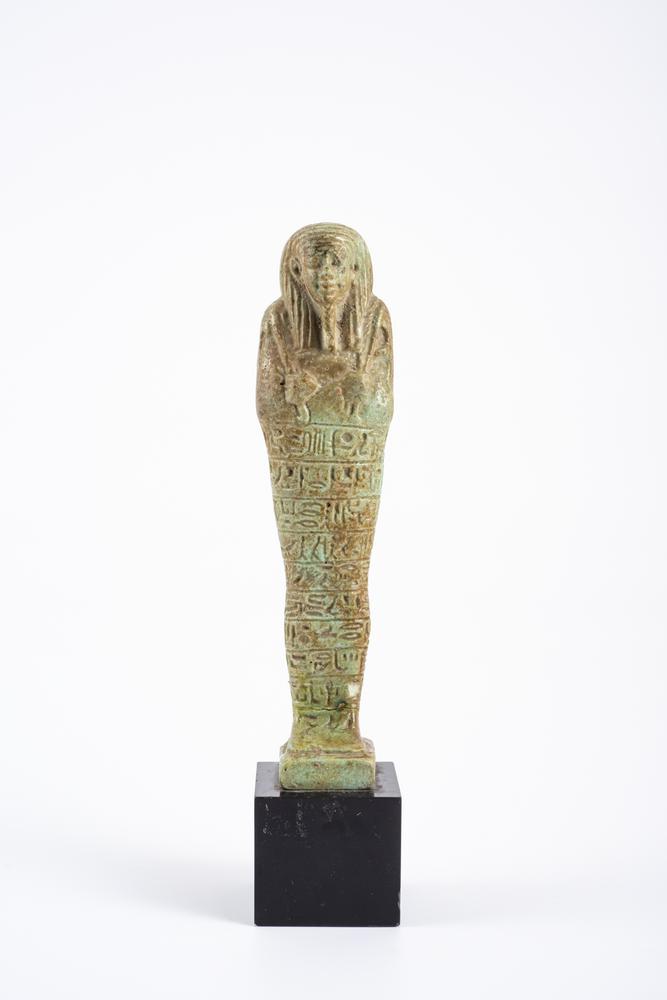 USHABTI DATAZIONE: XXVI Dinastia 664-525 a. C. MATERIA E TECNICA: faience egiziana verdastra, smalto lucente, modellato a stampo Figura mummiforme, stante frontalmente, con parrucca tripartita, coperta dal fazzoletto nemes a righe e lunga barba intrecciata posticcia; tratti del viso accuratamente definiti; braccia incrociate sul petto a sostenere una zappa nella mano destra ed una falce nell’altra; sulle gambe dieci linee d’iscrizione geroglifica impressa, sovrapposte in orizzontale, contenenti parte del capitolo XXX del Libro dei Morti ed il nome del defunto. Sulla schiena pilastro dorsale. PRODUZIONE: cultura egiziana STATO DI CONSERVAZIONE: integralmente ricomposto da due frammenti DIMENSIONI: alt. cm 15,2 Completo di base in marmo nero