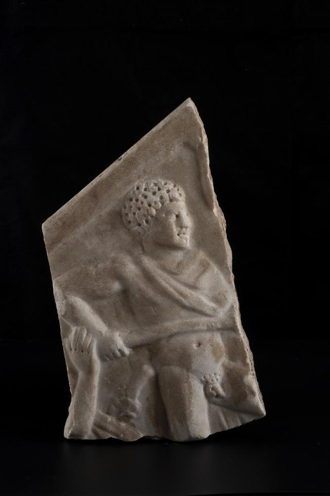 DATAZIONE: II-III sec. d. C. MATERIA E TECNICA: marmo italico a grana fine, scolpito e levigato Frammento di lastra con scena di combattimento; un giovane uomo dai folti capelli ricciuti, nudo, con solo la clamide gettata sul torace combatte con una lancia; dietro a lui tracce di un'altra figura PRODUZIONE: cultura romana STATO DI CONSERVAZIONE: lacunosa su tre lati DIMENSIONI: alt. cm 35; lungh. cm22 PROVENIENZA: Galleria Archeo, Milano, 2006 Il lotto, in base alla legge italiana, non è esportabile / This lot, according to Italian law, can not be exported