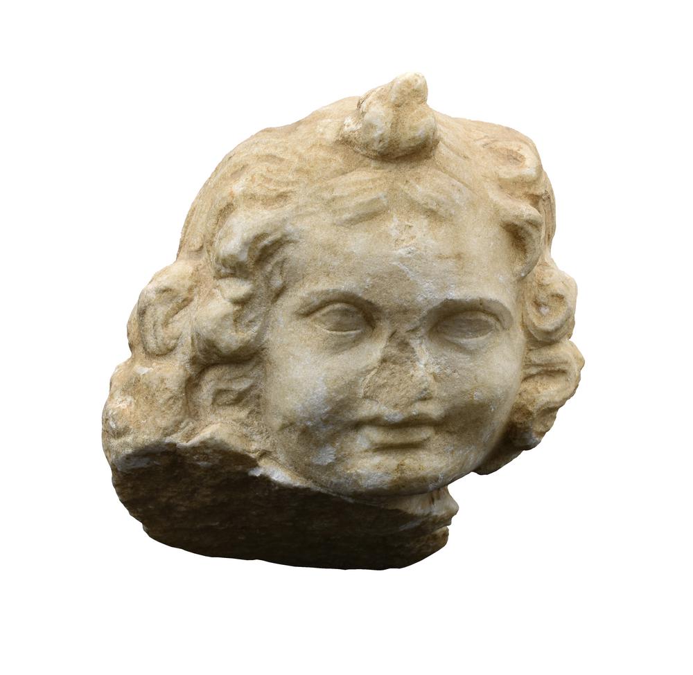 Piccola testa pertinente ad una scultura di Eros, voltaa leggermente a destra, i capelli formano una massa voluminosa e ricadono in boccoli ai lati del volto e sono annodati sopra la fronte; la fronte è larga, gli occhi, ben chiaroscurati, hanno indicazione di sopracciglia e pupille; le guance sono paffute e la bocca ha labbra carnose e appena dischiuse, il mento piccolo e tondeggiante; sopra la spalla destra le tracce di un tenone o di un attacco con un’altra statua fanno pensare che in origine il pezzo facesse parte di un gruppo raffigurante Afrodite ed Eros