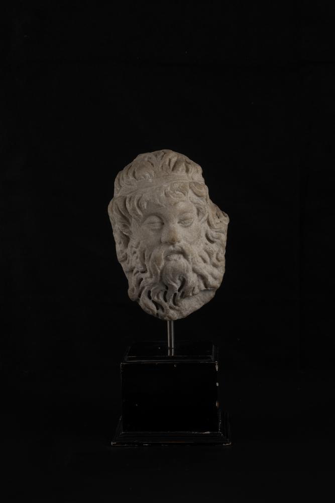 TESTA BARBATA DATAZIONE: XIII-XIV sec. d. C. MATERIA E TECNICA: marmo bianco italico a grana media, scolpito, levigato e rifinito a trapano Piccola testa maschile volta leggermente a sinistra raffigurante un uomo anziano con i capelli fermati da una tenia e ricadenti in ampie ciocche che si confondono con la barba fluente che incornicia il volto; gli occhi sono molto allungati, il naso schiacciato e gli zigomi pronunciati, le labbra semiaperte a conferire un’espressione patetica. La piccola testa era verosimilmente parte di un altorilievo, Completo di base quadrangolare in legno nero. PRODUZIONE: cultura romanico-gotica STATO DI CONSERVAZIONE: integra DIMENSIONI: alt. complessiva cm 34, testa alt. cm 19