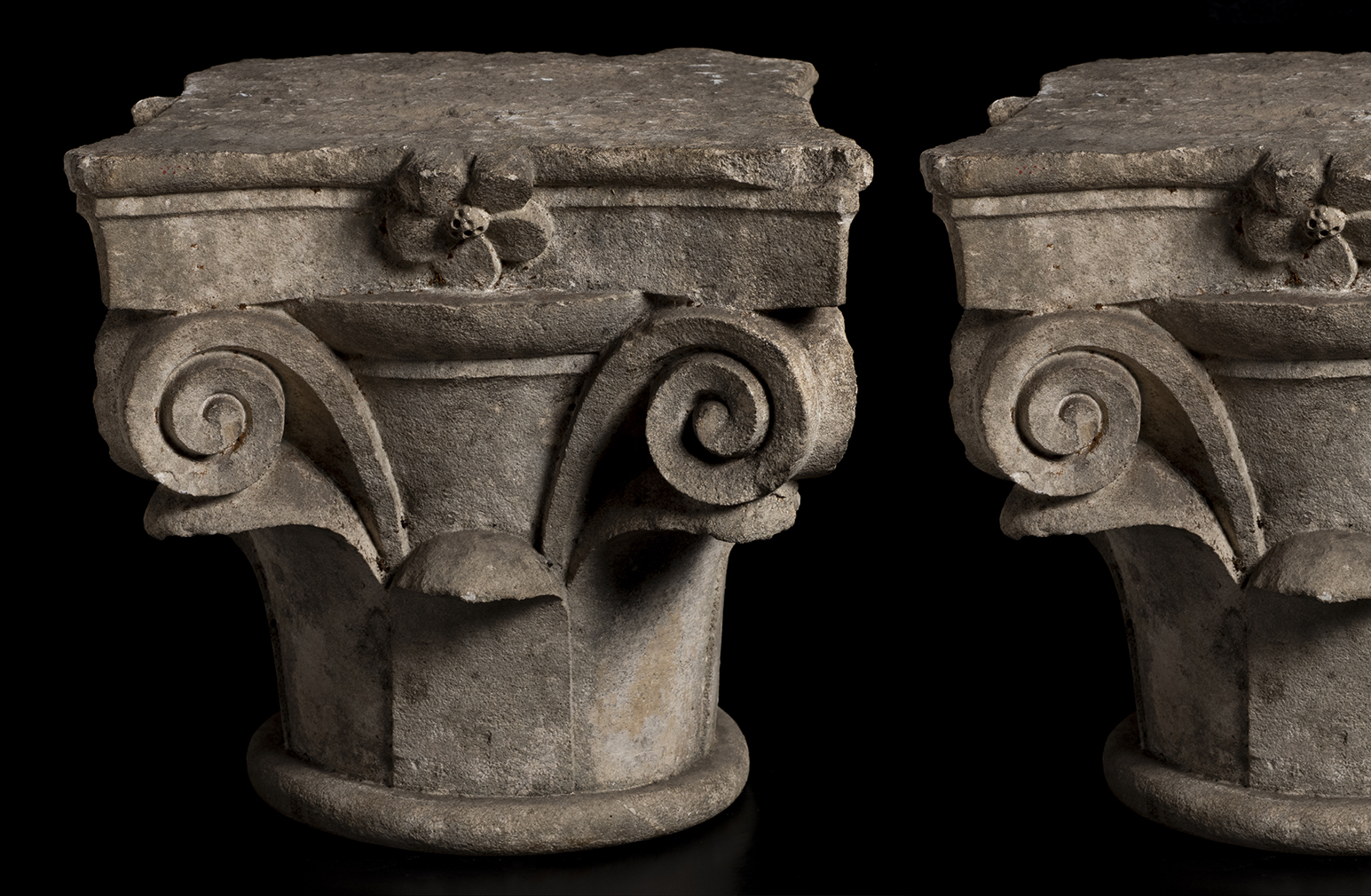 COPPIA DI CAPITELLI DATAZIONE: XV sec. d. C MATERIA E TECNICA: calcare bianco scolpito Coppia di capitelli a foglie d’acqua con volute angolari e rosetta centrale STATO DI CONSERVAZIONE: integri, lievi scheggiature DIMENSIONI: alt. cm 34 En suite con le colonne al lotto precedente