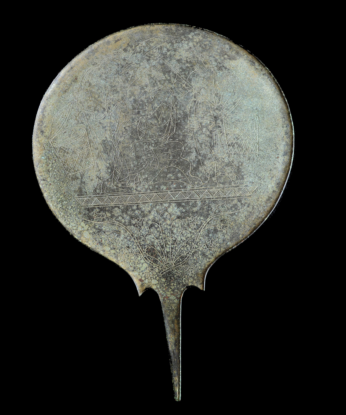 DECORAZIONE: eseguita nel XIX secolo dalla parte non riflettente. All’interno dello spazio circolare si svolge una scena di corteggiamento: al centro si trova una giovane donna assisa e volta a destra, on capelli mossi e lungo mantello plissettato intenta a rimirarsi in uno specchio che tiene nella sinistra, di fronte a lei un giovane stante è in atto di farle una carezza, dietro a lui una cista col coperchio aperto; dietro alla figura centrale un’ancella ripara la sua padrona con un lungo parasole, dietro a lei un’altra cista aperta; in esergo una palmetta aperta a ventaglio fra volute