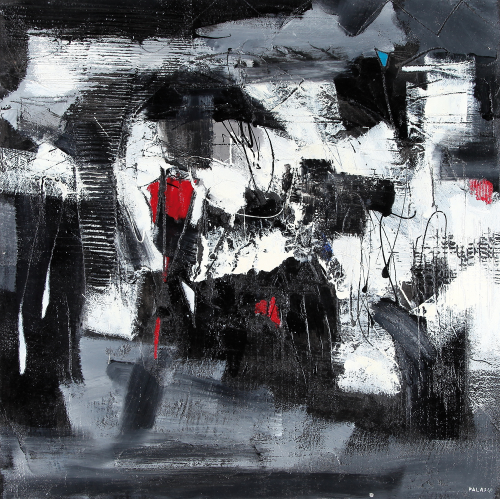 DIEGO PALASGO Noale (VE) 1954 Notte in città, 1995 polimaterico su tavola cm. 80x80, firma in basso a destra, firma, titolo e dedica ad personam al retro, certificato d'autenticità della Est Bracha allegato.